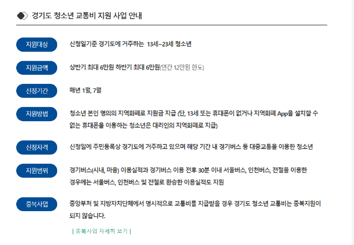 신청자격 주민등록상 경기도 거주 및 경기 대중교통 이용 청소년