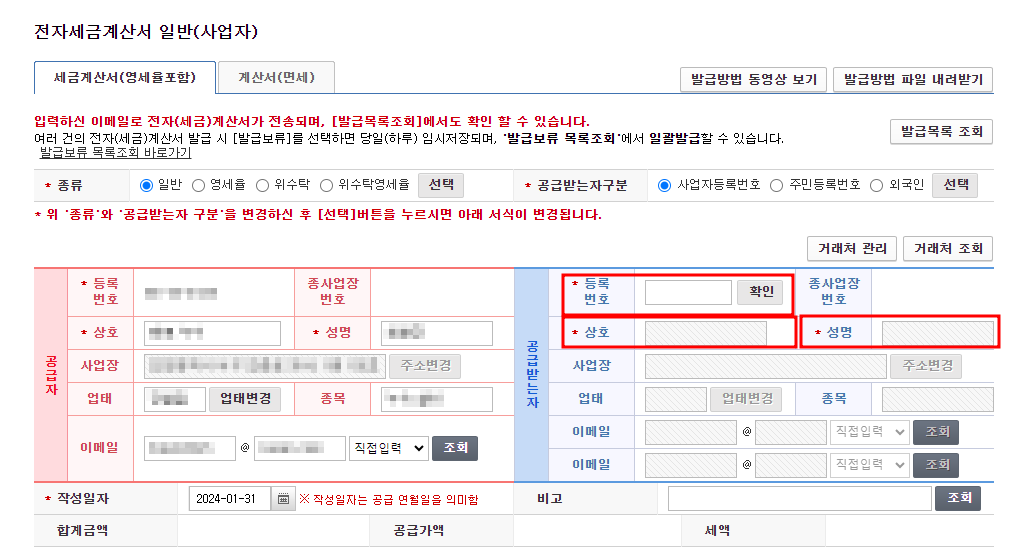 공급받는 자(파란색)에 발급해 줄 사업자의 정보를 입력해야 합니다.