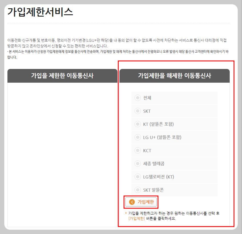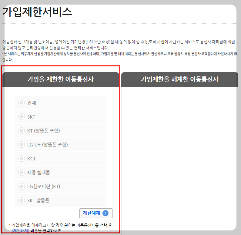 가입제한 서비스를 눌러 들어가면