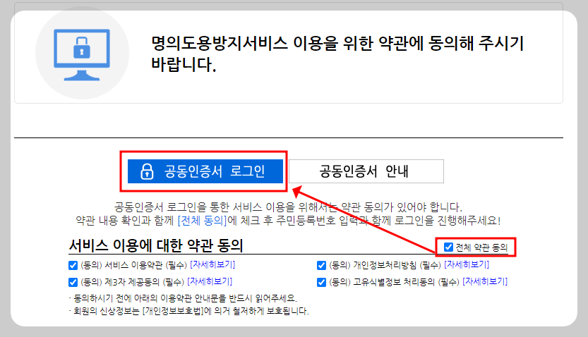 전체 약관 동의를 해준 후 공동인증서 로그인을 눌러줍니다.